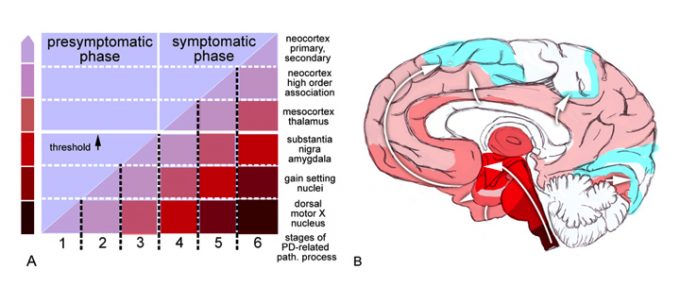 Alpha-synuclein deposits can be seen in the gut prior to development of motor symptoms of Parkinson’s disease (PD), up to 20 years prior to diagnosis. Alpha-synuclein refers to the abnormal protein that is also seen in the brains of patients with PD. There can also be PD-type pathology (abnormalities) found in the parasympathetic neurons of the vagus and sacral nerves. These nerves connect the brain to the visceral organs and are involved in the autonomic (i.e., automatic, subconscious) nervous system.