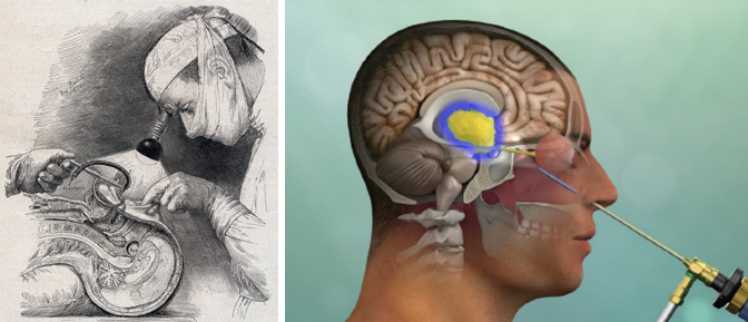 Banner image: Dr. Harvey Cushing performing sublabial transsphenoidal surgery with a head lamp, drawn in 1912 by Max Brodel, contrasted with current endonasal transsphenoidal approach for craniopharyngioma illuminated with high definition endoscope.